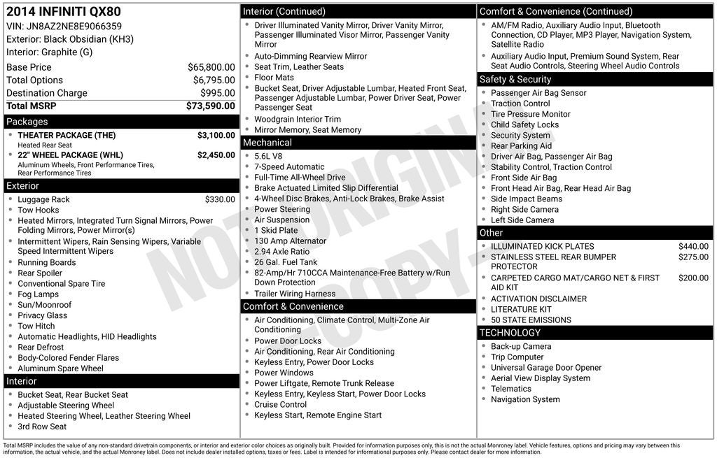 Equipped with 22 Wheel Package (22 x 8.0 9-Spoke Forged Aluminum Alloy Wheels), Theater Package (120V Power Outlet, Dual 7 Color Monitors, Heated 2nd-Row Seats, and Wireless Headphones (2)), 13 Speakers, 2.94 Axle Ratio, 20 7-Spoke Aluminum Alloy Wheels, 3rd row seats: split-bench, 4-Wheel Disc Brakes, ABS brakes, Activation Disclaimer, Air Conditioning, Alloy wheels, AM/FM radio: SiriusXM, Anti-whiplash front head restraints, Auto tilt-away steering wheel, Auto-dimming door mirrors, Auto-dimming Rear-View mirror, Auto-leveling suspension, Automatic temperature control, Bose Premium Sound System, Brake assist, Bumpers: body-color, Carpeted Cargo Mat/Cargo Net & First Aid Kit, CD player, Delay-off headlights, Driver door bin, Driver vanity mirror, Dual front impact airbags, Dual front side impact airbags, Electronic Stability Control, Emergency communication system: INFINITI Connection, Four wheel independent suspension, Front anti-roll bar, Front Bucket Seats, Front Center Armrest, Front dual zone A/C, Front fog lights, Front reading lights, Fully automatic headlights, Garage door transmitter: HomeLink, Genuine wood console insert, Genuine wood dashboard insert, Genuine wood door panel insert, Heated door mirrors, Heated Front Bucket Seats, Heated front seats, Heated steering wheel, High intensity discharge headlights: Bi-Xenon, Illuminated entry, Illuminated Kick Plates, Leather Shift Knob, Leather steering wheel, Leather-Appointed Seat Trim w/Tuscan Burl, Literature Kit, Low tire pressure warning, Memory seat, Navigation System, Occupant sensing airbag, Outside temperature display, Overhead airbag, Overhead console, Panic alarm, Passenger door bin, Passenger vanity mirror, Power door mirrors, Power driver seat, Power Liftgate, Power moonroof, Power passenger seat, Power steering, Power windows, Radio data system, Rain sensing wipers, Rear air conditioning, Rear anti-roll bar, Rear audio controls, Rear reading lights, Rear seat center armrest, Rear window defroster, Rear window wiper, Reclining 3rd row seat, Remote keyless entry, Roof rack: rails only, Roof Rail Crossbars, Security system, Speed control, Speed-sensing steering, Split folding rear seat, Spoiler, Stainless Steel Rear Bumper Protector, Steering wheel memory, Steering wheel mounted audio controls, Tachometer, Telescoping steering wheel, Tilt steering wheel, Traction control, Trip computer, Turn signal indicator mirrors, Variably intermittent wipers, and Voltmeter.