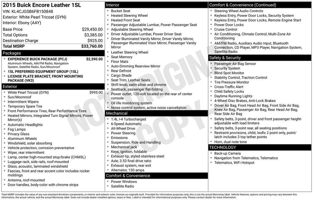 ***CALL 740-773-2153 FOR MOST ACCURATE INFORMATION***Discover the remarkable 2015 Buick Encore Leather, a sophisticated and versatile SUV that seamlessly blends style, performance, and unparalleled comfort. This exceptional vehicle boasts an impressive array of features, making it the perfect choice for the discerning driver.- Experience Buick Package (DISC)- Preferred Equipment Group 1SL- 6 Speakers- AM/FM radio: SiriusXM- CD player- Premium audio system: IntelliLink- Radio data system- Radio: AM/FM Audio System w/MP3 CD Player- Radio: AM/FM Audio System w/Nav/Single CD Player- SiriusXM Satellite RadioPowered by the ECOTEC 1.4L I4 SMPI DOHC Turbocharged VVT engine, this Encore Leather delivers a dynamic and efficient driving experience. With its 6-Speed Automatic Electronic with Overdrive transmission and All-Wheel Drive, you'll enjoy exceptional control and confidence on the road. The impressive fuel economy, with 23 City MPG and 30 Highway MPG, makes this SUV an exceptional choice for both daily commutes and weekend adventures.The exquisite White exterior, complemented by the Leather-Appointed Seat Trim, creates a refined and sophisticated appearance that is sure to turn heads. The Buick Encore Leather's impressive list of features, including the Power Tilt-Sliding Moonroof, Heated Steering Wheel, and Heated Front Seats, ensure a truly luxurious driving experience.Discover the perfect balance of style, performance, and technology in the 2015 Buick Encore Leather. This exceptional SUV is ready to elevate your driving experience and exceed your expectations. Visit our showroom today to take this remarkable vehicle for a test drive and experience the difference for yourself.Why Buy From Coughlin?At Coughlin Automotive, we keep over 1,000 pre-owned vehicles in stock across 18 dealerships. Enjoy small-town service with big-store selection. Every vehicle is inspected, competitively priced, and backed by our commitment to honesty, value, and customer satisfaction.We carry all makes and models and have vehicles in all different colors. Our pre-owned vehicles could have some of the following features listed: Alloy wheels, aluminum wheels, backup camera, Bluetooth®, cargo package, chrome wheels, convenience package, leather seats, navigation system, power package, remote start, SE package, safety package, sunroof/moonroof, tow package, adaptive cruise control, comfort package, trailer package, appearance package, acoustical package, DVD entertainment system, preferred package, technology package, driver confidence package, audio package, heat package, memory package, off-road package, premium package, premium sound package, remote vehicle starter prep package.