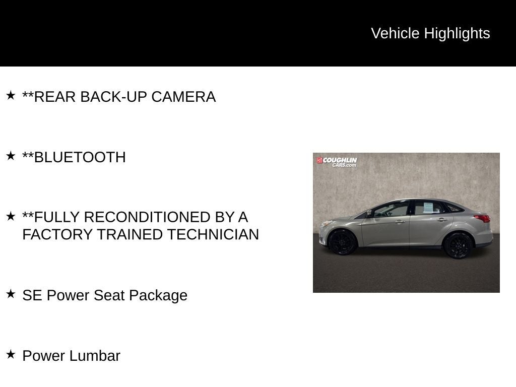 **REAR BACK-UP CAMERA, **Bluetooth®, **FULLY RECONDITIONED BY A FACTORY TRAINED TECHNICIAN, Power Lumbar, SE Power Seat Package, 16 Painted Aluminum Alloy Wheels, 6 Speakers, ABS brakes, Air Conditioning, Alloy wheels, AM/FM radio, Brake assist, Bumpers: body-color, CD player, Cloth Front Bucket Seats, Compass, Delay-off headlights, Driver door bin, Driver vanity mirror, Dual front impact airbags, Dual front side impact airbags, Electronic Stability Control, Emergency communication system: 911 Assist, Equipment Group 200A, Exterior Parking Camera Rear, Four wheel independent suspension, Front anti-roll bar, Front Bucket Seats, Front Center Armrest, Front reading lights, Fully automatic headlights, Illuminated entry, Knee airbag, Low tire pressure warning, Occupant sensing airbag, Outside temperature display, Overhead airbag, Overhead console, Panic alarm, Passenger door bin, Passenger vanity mirror, Power door mirrors, Power steering, Power windows, Radio data system, Radio: AM/FM Single-CD/MP3-Capable, Rear anti-roll bar, Rear Parking Sensors, Rear window defroster, Remote keyless entry, Speed control, Split folding rear seat, Steering wheel mounted audio controls, SYNC Communications & Entertainment System, Tachometer, Telescoping steering wheel, Tilt steering wheel, Traction control, Trip computer, Turn signal indicator mirrors, Variably intermittent wipers, Power Lumbar, SE Power Seat Package.