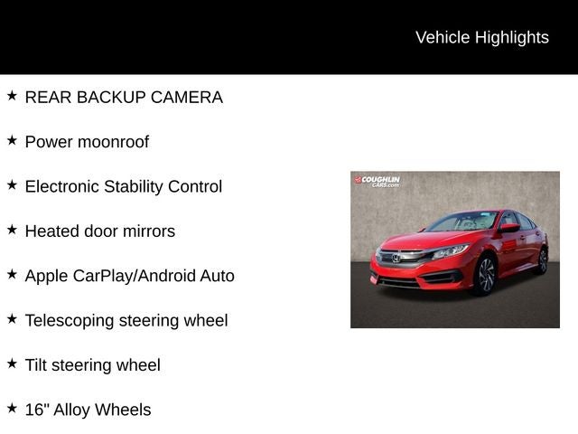 Black w/Cloth Seat Trim, 16 Alloy Wheels, Apple CarPlay/Android Auto, Electronic Stability Control, Heated door mirrors, Power moonroof, Telescoping steering wheel, Tilt steering wheel, 4-Wheel Disc Brakes, 8 Speakers, ABS brakes, Air Conditioning, Alloy wheels, AM/FM radio, Automatic temperature control, Brake assist, Bumpers: body-color, Cloth Seat Trim, Compass, Delay-off headlights, Driver door bin, Driver vanity mirror, Dual front impact airbags, Dual front side impact airbags, Emergency communication system, Exterior Parking Camera Rear, Four wheel independent suspension, Front anti-roll bar, Front Bucket Seats, Front Center Armrest, Front reading lights, Fully automatic headlights, Illuminated entry, Low tire pressure warning, Occupant sensing airbag, Outside temperature display, Overhead airbag, Panic alarm, Passenger door bin, Passenger vanity mirror, Power door mirrors, Power steering, Power windows, Radio data system, Radio: 180-Watt AM/FM/HD/SiriusXM Audio System, Rear anti-roll bar, Rear seat center armrest, Rear window defroster, Reclining Front Bucket Seats, Remote keyless entry, Security system, Speed control, Speed-sensing steering, Speed-Sensitive Wipers, Split folding rear seat, Steering wheel mounted audio controls, Tachometer, Traction control, Trip computer, Variably intermittent wipers, REAR BACKUP CAMERA, Black w/Cloth Seat Trim, 16 Alloy Wheels, Apple CarPlay/Android Auto, Electronic Stability Control, Heated door mirrors, Power moonroof, Telescoping steering wheel, Tilt steering wheel.
