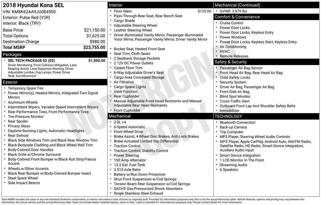 ***CALL 740-773-2153 FOR MOST ACCURATE INFORMATION***Discover the perfect blend of style, technology, and performance in this 2018 Hyundai Kona SEL. Equipped with a suite of advanced features, this compact SUV is designed to elevate your driving experience.- SEL TECH PACKAGE 02- Hyundai Smart Sense- Lane Keeping Assist- Driver Attention Warning- Forward Collision-Avoidance Assist- Pedestrian Detection- 8-Way Power Driver Seat- Fog LightsThis Kona's sleek exterior in a vibrant Red hue commands attention, while the spacious interior offers a comfortable and well-appointed cabin. With an impressive 27 city/33 highway MPG, this efficient I4 engine and 6-Speed Automatic transmission provide a smooth and responsive ride.The advanced safety features, including Forward Collision-Avoidance Assist and Pedestrian Detection, help keep you and your loved ones secure on the road. The Hyundai Smart Sense technology and Lane Keeping Assist provide added peace of mind, allowing you to navigate with confidence.Step inside and experience the convenience of the 8-Way Power Driver Seat, which offers customizable comfort and support. The Fog Lights enhance visibility in challenging weather conditions, ensuring you can tackle any journey with ease.This Kona SEL is the perfect blend of style, technology, and performance, making it an exceptional choice for the discerning driver. Visit our showroom today to take this remarkable vehicle for a test drive and discover why the Kona is the perfect companion for your adventures.Why Buy From Coughlin?At Coughlin Automotive, we keep over 1,000 pre-owned vehicles in stock across 18 dealerships. Enjoy small-town service with big-store selection. Every vehicle is inspected, competitively priced, and backed by our commitment to honesty, value, and customer satisfaction.We carry all makes and models and have vehicles in all different colors. Our pre-owned vehicles could have some of the following features listed: Alloy wheels, aluminum wheels, backup camera, Bluetooth®, cargo package, chrome wheels, convenience package, leather seats, navigation system, power package, remote start, SE package, safety package, sunroof/moonroof, tow package, adaptive cruise control, comfort package, trailer package, appearance package, acoustical package, DVD entertainment system, preferred package, technology package, driver confidence package, audio package, heat package, memory package, off-road package, premium package, premium sound package, remote vehicle starter prep package.