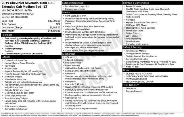 3.42 Rear Axle Ratio, 4-Wheel Disc Brakes, 4.2 Diagonal Color Display Driver Info Center, 40/20/40 Front Split Bench Seat, 6 Speakers, ABS brakes, Air Conditioning, Alloy wheels, AM/FM radio: SiriusXM, Body Color Bodyside Moldings, Body-Color Door Handles, Body-Color Mirror Caps, Body-Color Power-Adjustable Heated Outside Mirrors, Bodyside moldings, Brake assist, CD player, Chevrolet 4G LTE, Chevrolet Connected Access, Cloth Seat Trim, Color-Keyed Carpeting Floor Covering, Compass, Deep-Tinted Glass, Delay-off headlights, Driver & Fr Passenger Illuminated Vanity Mirrors, Driver door bin, Driver vanity mirror, Dual front impact airbags, Dual front side impact airbags, Electronic AutoTrac Transfer Case, Electronic Stability Control, Emergency communication system: OnStar and Chevrolet connected services capable, Exterior Parking Camera Rear, Front anti-roll bar, Front Center Armrest w/Storage, Front License Plate Kit, Front reading lights, Front wheel independent suspension, Fully automatic headlights, HD Radio, Heated door mirrors, High-Intensity Discharge Headlights, Illuminated entry, Leather Wrapped Steering Wheel, Low tire pressure warning, Manual Tilt-Wheel Steering Column, Occupant sensing airbag, OnStar & Chevrolet Connected Services Capable, Option Pkg Discount Not Desired Acknowledgement, Outside temperature display, Overhead airbag, Overhead console, Panic alarm, Passenger door bin, Passenger vanity mirror, Power door mirrors, Power steering, Power windows, Premium audio system: Chevrolet MyLink, Radio data system, Radio: AM/FM 8 Diagonal Color Touch Screen, Rear 60/40 Folding Bench Seat (Folds Up), Rear reading lights, Rear step bumper, Rear Wheelhouse Liners, Remote Keyless Entry, Remote keyless entry, Remote Locking Tailgate, Single Slot CD/MP3 Player, SiriusXM Radio, Speed control, Speed-sensing steering, Split folding rear seat, Steering Wheel Audio Controls, Steering wheel mounted audio controls, Tachometer, Thin Profile LED Fog Lamps, Tilt steering wheel, Traction control, Trip computer, Variably intermittent wipers, Voltmeter. 2019 Chevrolet Silverado 1500 LD