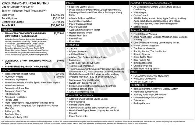 170 Amp Alternator, 3.49 Final Drive Axle Ratio, 4-Wheel Disc Brakes, 6 Speakers, 6-Speaker Audio System Feature, 6-Way Power Front Passenger Seat Adjuster, ABS brakes, Advanced Adaptive Cruise Control, Air Conditioning, Alloy wheels, AM/FM radio: SiriusXM, Apple CarPlay/Android Auto, Auto-dimming door mirrors, Auto-dimming Rear-View mirror, Automatic temperature control, Brake assist, Bumpers: body-color, Child-Seat-Sensing Airbag, Compass, Delay-off headlights, Driver door bin, Driver vanity mirror, Dual front impact airbags, Dual front side impact airbags, Electronic Stability Control, Emergency communication system: OnStar and Chevrolet connected services capable, Enhanced Automatic Emergency Braking, Enhanced Convenience & Driver Confidence II Pkg, Exterior Parking Camera Rear, Following Distance Indicator, Forward Collision Alert, Four wheel independent suspension, Front anti-roll bar, Front Bucket Seats, Front Center Armrest, Front dual zone A/C, Front Pedestrian Braking, Front reading lights, Fully automatic headlights, Garage door transmitter, HD Surround Vision, Heated door mirrors, Heated Driver & Front Passenger Seats, Heated front seats, Heated Rear Outboard Seating Positions, Heated steering wheel, Heavy-Duty Cooling System, High-Intensity Discharge Headlights, Hitch Guidance, Hitch Guidance w/Hitch View, Illuminated entry, IntelliBeam Headlamps, Knee airbag, Lane Keep Assist w/Lane Departure Warning, Leather Shift Knob, Low tire pressure warning, Memory Settings For Driver Seat & Exterior Mirrors, Navigation System, Occupant sensing airbag, Outside temperature display, Overhead airbag, Overhead console, Panic alarm, Passenger door bin, Passenger vanity mirror, Perforated Leather-Appointed Seat Trim, Power door mirrors, Power driver seat, Power Liftgate, Power passenger seat, Power steering, Power Tilt & Telescoping Steering Column, Power windows, Preferred Equipment Group 1RS, Radio data system, Radio: Chevrolet Infotainment 3 Plus System, Radio: Chevrolet Infotainment 3 Premium System, Rear anti-roll bar, Rear Camera Mirror, Rear reading lights, Rear seat center armrest, Rear window defroster, Rear window wiper, Remote keyless entry, Ride & Handling Suspension, Safety Alert Seat, Security system, SiriusXM w/360L, Speed control, Speed-sensing steering, Split folding rear seat, Spoiler, Steering wheel mounted audio controls, Tachometer, Telescoping steering wheel, Tilt steering wheel, Traction control, Trailering Equipment, Trip computer, Turn signal indicator mirrors, Variably intermittent wipers, Ventilated Driver & Front Passenger Seats, Voltmeter, Wheels: 20 Dark Android Machined-Face Aluminum, Wheels: 21 Gloss Black Aluminum, Wireless Charging. 2020 Chevrolet Blazer