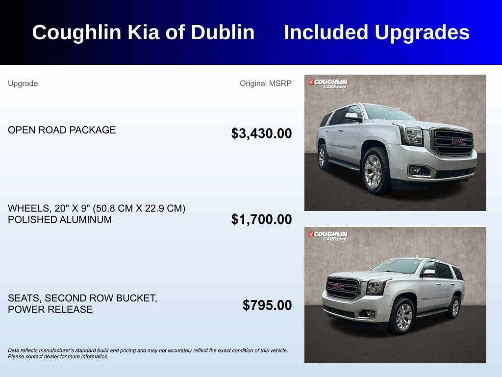 Equipped with Enhanced Driver Alert Package (Automatic Emergency Braking, Forward Collision Alert, IntelliBeam Automatic High Beam On/Off, and Lane Keep Assist w/Lane Departure Warning), License Plate Front Mounting Package, Memory Package, Open Road Package (Power Tilt-Sliding Sunroof w/Express-Open/Close and Rear Seat Blu-Ray/DVD Entertainment System), Preferred Equipment Group 4SA (4-Wheel Antilock Disc Brakes, 5 Auxiliary 12-volt Power Outlets, Black Assist Steps w/Chrome Strip, Hands Free Power Programmable Rear Liftgate, Heated Leather-Wrapped Steering Wheel, Inside Rear-View Auto-Dimming Mirror, Lane Change Alert w/Side Blind Zone Alert, Passive Entry System, Power Release 2nd Row 60/40 Split-Folding Bench Seat, Power Tilt & Telescopic Steering Column, Power-Adjustable Pedals For Accelerator & Brake, Push Button Keyless Start, Rear Cross Traffic Alert, Remote Keyless Entry, and Universal Home Remote), Premium Smooth Ride Suspension Package, 4WD, 20 x 9 Polished Aluminum Wheels, 3.08 Rear Axle Ratio, 3rd row seats: split-bench, 4-Wheel Disc Brakes, 9 Speakers, ABS brakes, Adjustable pedals, Air Conditioning, Alloy wheels, AM/FM radio: SiriusXM, Apple CarPlay/Android Auto, Auto High-beam Headlights, Auto-dimming door mirrors, Auto-dimming Rear-View mirror, Automatic temperature control, Bose Premium 9-Speaker System, Brake assist, Bumpers: body-color, CD Player, CD player, Compass, Delay-off headlights, Driver door bin, Driver vanity mirror, Dual front impact airbags, Dual front side impact airbags, Electronic Stability Control, Emergency communication system: OnStar and GMC connected services capable, Exterior Parking Camera Rear, Front anti-roll bar, Front Bucket Seats, Front Center Armrest, Front dual zone A/C, Front fog lights, Front reading lights, Front wheel independent suspension, Full-Feature Reclining Bucket Seats, Fully automatic headlights, Garage door transmitter, Heated & Ventilated Driver & Front Passenger Seats, Heated door mirrors, Heated front seats, Heated rear seats, Heated steering wheel, Illuminated entry, Leather steering wheel, Low tire pressure warning, Memory seat, Occupant sensing airbag, Outside temperature display, Overhead airbag, Overhead console, Panic alarm, Passenger door bin, Passenger vanity mirror, Pedal memory, Perforated Leather-Appointed Seat Trim, Power door mirrors, Power driver seat, Power Liftgate, Power passenger seat, Power Release 2nd Row Bucket Seats, Power steering, Power windows, Premium audio system: IntelliLink, Radio: AM/FM/SiriusXM, Radio: AM/FM/SiriusXM w/Navigation, Rain sensing wipers, Rear air conditioning, Rear anti-roll bar, Rear reading lights, Rear seat center armrest, Rear window defroster, Rear window wiper, Remote keyless entry, Roof rack: rails only, Security system, SiriusXM NavTraffic, SiriusXM Radio, Speed control, Speed-sensing steering, Split folding rear seat, Spoiler, Steering wheel memory, Steering wheel mounted audio controls, Tachometer, Telescoping steering wheel, Tilt steering wheel, Traction control, Trip computer, Turn signal indicator mirrors, Variably intermittent wipers, Ventilated front seats, Voltmeter, and Wheels: 18 x 8.5 Bright Machined Aluminum.
