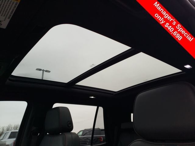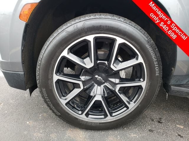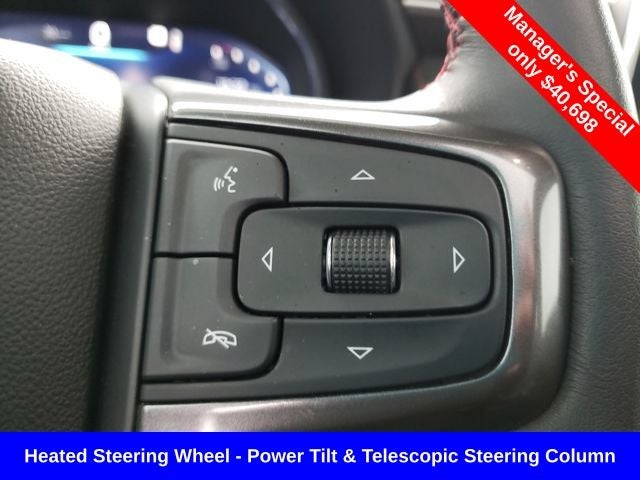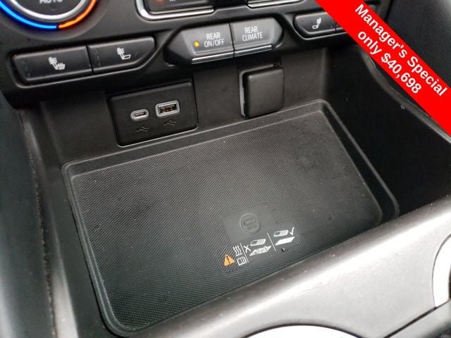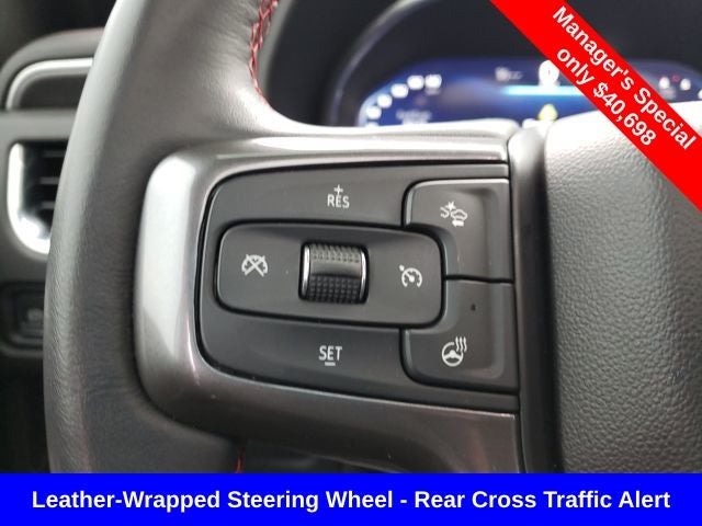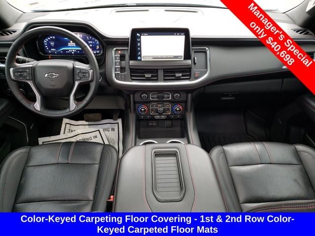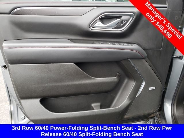 4WD, Jet Black/Victory Red w/Perforated Leather Seat Trim, 1st & 2nd Row Color-Keyed Carpeted Floor Mats, 2nd Row Pwr Release 60/40 Split-Folding Bench Seat, 3rd Row 60/40 Power-Folding Split-Bench Seat, Auto-Dimming Inside Rear-View Mirror, Automatic Stop/Start, Bose 9-Speaker Stereo Audio System Feature, Bright Front & Rear Door Sill Plates, Color-Keyed Carpeting Floor Covering, Driver & Front Outboard Passenger Airbags, Driver Alert Package, Enhanced Driver Information Center, Floor Console w/Storage Area, Hands-Free Rear Power Programmable Liftgate, HD Surround Vision, Heated 2nd Row Outboard Seats, Heated Steering Wheel, Infotainment Display, Lane Change Alert w/Side Blind Zone Alert, Leather-Wrapped Steering Wheel, LED Daytime Running Lamps, Luxury Package, Memory Settings, Memory Settings for Driver, Navigation System, Outside Heated Power-Adjustable Mirrors, Power Tilt & Telescopic Steering Column, Preferred Equipment Group 1SP, Rear Cross Traffic Alert, Rear Pedestrian Alert, Remote Start, SiriusXM Radio w/360L, Start/Stop System Disable Button, Universal Home Remote, Wireless Charging, 10-Way Power Driver & Passenger Seat Adjusters, 3.23 Rear Axle Ratio, 3rd row seats: split-bench, 4-Wheel Disc Brakes, 9 Speakers, ABS brakes, Air Conditioning, Alloy wheels, AM/FM radio: SiriusXM with 360L, Apple CarPlay/Android Auto, Auto High-beam Headlights, Auto-dimming Rear-View mirror, Automatic temperature control, Brake assist, Bumpers: body-color, Compass, Delay-off headlights, Driver door bin, Driver vanity mirror, Dual front impact airbags, Dual front side impact airbags, Dual-Pane Power Panoramic Sunroof, Electronic Stability Control, Emergency communication system: OnStar and Chevrolet connected services capable, Four wheel independent suspension, Front anti-roll bar, Front Bucket Seats, Front Center Armrest, Front dual zone A/C, Front High-Back Reclining Bucket Seats, Front reading lights, Fully automatic headlights, Garage door transmitter, Heated door mirrors, Heated Driver & Front Passenger Seats, Heated front seats, Illuminated entry, Leather steering wheel, Low tire pressure warning, Memory seat, Not Equipped w/Front & Rear Park Assist, Not Equipped w/Heated Steering Wheel (DISC), Not Equipped w/Steering Column Lock, Occupant sensing airbag, Outside temperature display, Overhead airbag, Overhead console, Panic alarm, Passenger door bin, Passenger vanity mirror, Perforated Leather Seat Trim, Power door mirrors, Power driver seat, Power Liftgate, Power passenger seat, Power Release 2nd Row Bucket Seats, Power steering, Power windows, Premium audio system: Chevrolet Infotainment System 3, Premium Smooth Ride Suspension, Radio: Chevrolet Infotainment 3 Premium System, Rain sensing wipers, Rear air conditioning, Rear anti-roll bar, Rear reading lights, Rear seat center armrest, Rear window defroster, Rear window wiper, Remote keyless entry, Roof rack: rails only, Security system, Set of 4 Wheel Locks (LPO), Speed control, Speed-sensing steering, Split folding rear seat, Spoiler, Steering wheel mounted audio controls, Tachometer, Telescoping steering wheel, Tilt steering wheel, Traction control, Trip computer, Variably intermittent wipers, Voltmeter, Wheels: 22 x 9 Bright Machined, MOONROOF/SUNROOF, NAVIGATION/GPS, 4WD/AWD/4X4, REAR BACKUP CAMERA, 4WD, Jet Black/Victory Red w/Perforated Leather Seat Trim, 1st & 2nd Row Color-Keyed Carpeted Floor Mats, 2nd Row Pwr Release 60/40 Split-Folding Bench Seat, 3rd Row 60/40 Power-Folding Split-Bench Seat, Auto-Dimming Inside Rear-View Mirror, Automatic Stop/Start, Bose 9-Speaker Stereo Audio System Feature, Bright Front & Rear Door Sill Plates, Color-Keyed Carpeting Floor Covering, Driver & Front Outboard Passenger Airbags, Driver Alert Package, Enhanced Dri