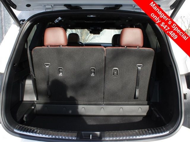 Equipped with Mahogany Interior Color Package, 10 Speakers, 3.648 Axle Ratio, 3rd row seats: split-bench, 4-Wheel Disc Brakes, ABS brakes, Air Conditioning, Alloy wheels, AM/FM radio: SiriusXM, Apple CarPlay & Android Auto, Auto High-beam Headlights, Auto-dimming Rear-View mirror, Automatic temperature control, Brake assist, Bumpers: body-color, Cargo Tray Seat Back, Carpet Floor Mats, Compass, Cross Bars, Delay-off headlights, Driver door bin, Driver vanity mirror, Dual front impact airbags, Dual front side impact airbags, Electronic Stability Control, Emergency communication system: 911 Connect, Exterior Parking Camera Rear, Four wheel independent suspension, Front anti-roll bar, Front Bucket Seats, Front Center Armrest, Front dual zone A/C, Front fog lights, Front reading lights, Fully automatic headlights, Garage door transmitter: HomeLink, harman/kardon® Speakers, Heads-Up Display, Heated & Ventilated Front Bucket Seats, Heated door mirrors, Heated front seats, Heated rear seats, Heated steering wheel, Hybrid Cargo Net, Illuminated entry, Knee airbag, Leather Shift Knob, Leather steering wheel, Low tire pressure warning, Memory seat, Navigation System, Occupant sensing airbag, Outside temperature display, Overhead airbag, Overhead console, Panic alarm, Passenger door bin, Passenger vanity mirror, Power door mirrors, Power driver seat, Power Liftgate, Power moonroof, Power passenger seat, Power steering, Power windows, Premium Nappa Leather Seat Trim, Radio data system, Radio: AM/FM Harman Kardon Audio System, Rain sensing wipers, Rear air conditioning, Rear anti-roll bar, Rear audio controls, Rear reading lights, Rear side impact airbag, Rear window defroster, Rear window wiper, Reclining 3rd row seat, Remote keyless entry, Roof rack: rails only, Security system, Smart Key w/ Push Button and Remote Start, Speed control, Speed-sensing steering, Split folding rear seat, Spoiler, Steering wheel mounted audio controls, Tachometer, Telescoping steering wheel, Tilt steering wheel, Traction control, Trip computer, Turn signal indicator mirrors, Variably intermittent wipers, Ventilated front seats, Ventilated rear seats, and Wheels: 20 x 7.5 Black Finish.