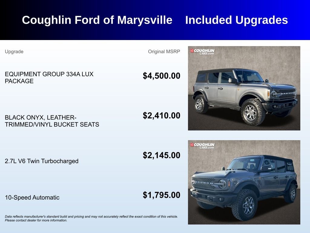 Safety is also a top priority, with the Bronco Badlands offering a comprehensive suite of advanced safety systems, including Blind Spot Monitoring, Pre-Collision Assist with Automatic Emergency Braking, and a 360-Degree Camera.
