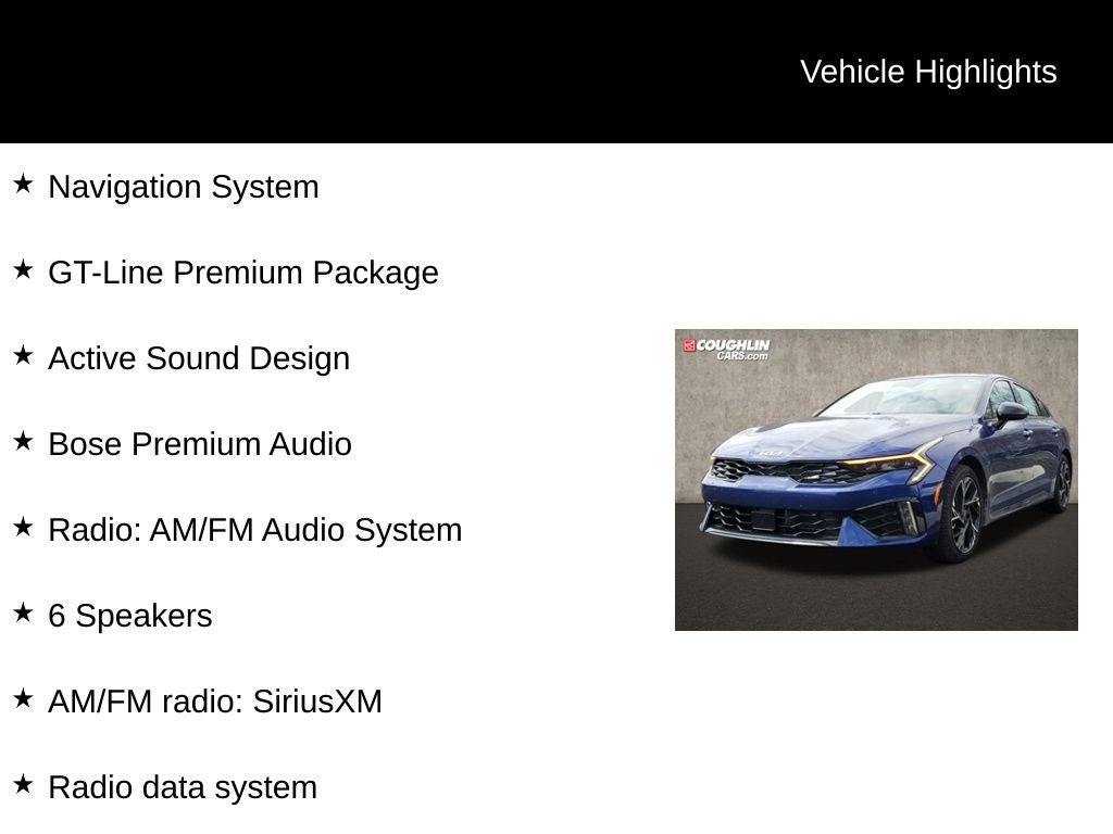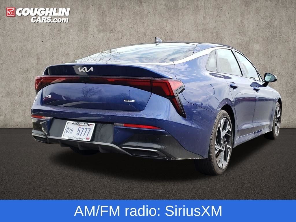 Certified. Yacht Blue 2025 Kia K5 GT-Line AWD 8-Speed Automatic I4 K5 GT-Line, 4D Sedan, I4, 8-Speed Automatic, AWD, Yacht Blue, Black w/SynTex Seat Trim, 4-Wheel Disc Brakes, 6 Speakers, ABS brakes, Active Sound Design, Air Conditioning, Alloy wheels, AM/FM radio: SiriusXM, Auto High-beam Headlights, Automatic temperature control, Bose Premium Audio, Brake assist, Bumpers: body-color, Carpeted Floor Mats, Delay-off headlights, Driver door bin, Driver vanity mirror, Dual front impact airbags, Dual front side impact airbags, Electronic Stability Control, Emergency communication system: Kia Connect (includes 1 year free trial), Four wheel independent suspension, Front anti-roll bar, Front Bucket Seats, Front Center Armrest, Front dual zone A/C, Front fog lights, Front reading lights, Fully automatic headlights, GT-Line Premium Package, Heated door mirrors, Heated Front Bucket Seats, Heated front seats, Heated steering wheel, Illuminated entry, Knee airbag, Leather Shift Knob, Leather steering wheel, LED Interior Lighting, Low tire pressure warning, Navigation System, Occupant sensing airbag, Outside temperature display, Overhead airbag, Overhead console, Panic alarm, Panoramic Sunroof, Passenger door bin, Passenger vanity mirror, Power door mirrors, Power driver seat, Power steering, Power windows, Radio data system, Radio: AM/FM Audio System, Rear anti-roll bar, Rear seat center armrest, Rear side impact airbag, Rear window defroster, Remote keyless entry, Security system, Speed control, Speed-sensing steering, Split folding rear seat, Sport steering wheel, Steering wheel mounted audio controls, Tachometer, Telescoping steering wheel, Tilt steering wheel, Traction control, Trip computer, Turn signal indicator mirrors, Variably intermittent wipers, Wheels: 18 x 7.5J Gloss Black Machined Finish Alloy.